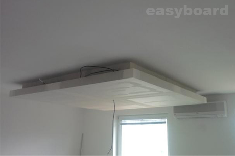 Na pripravenú podkladovú konštrukciu upevníme skrutkami TN 25 spodný sadrokartónový prefabrikát EasyBoard®. Prefabrikát sa skrutkuje do obvodových UD aj priečnych CD profilov.