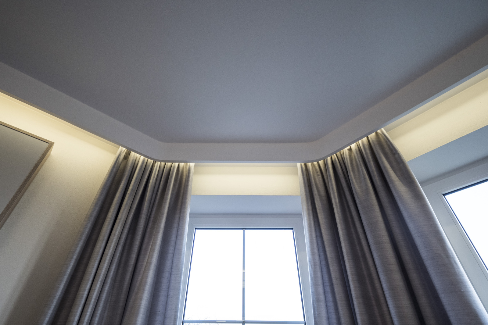 Vorhangstangenabdeckungen aus Gipskarton können dem Interieur angepaßt werden. Diese können auf die ganze Länge des Raumes von Wand zu Wand angewendet werden und elegant entweder von einer oder beiden Seiten beendet werden: